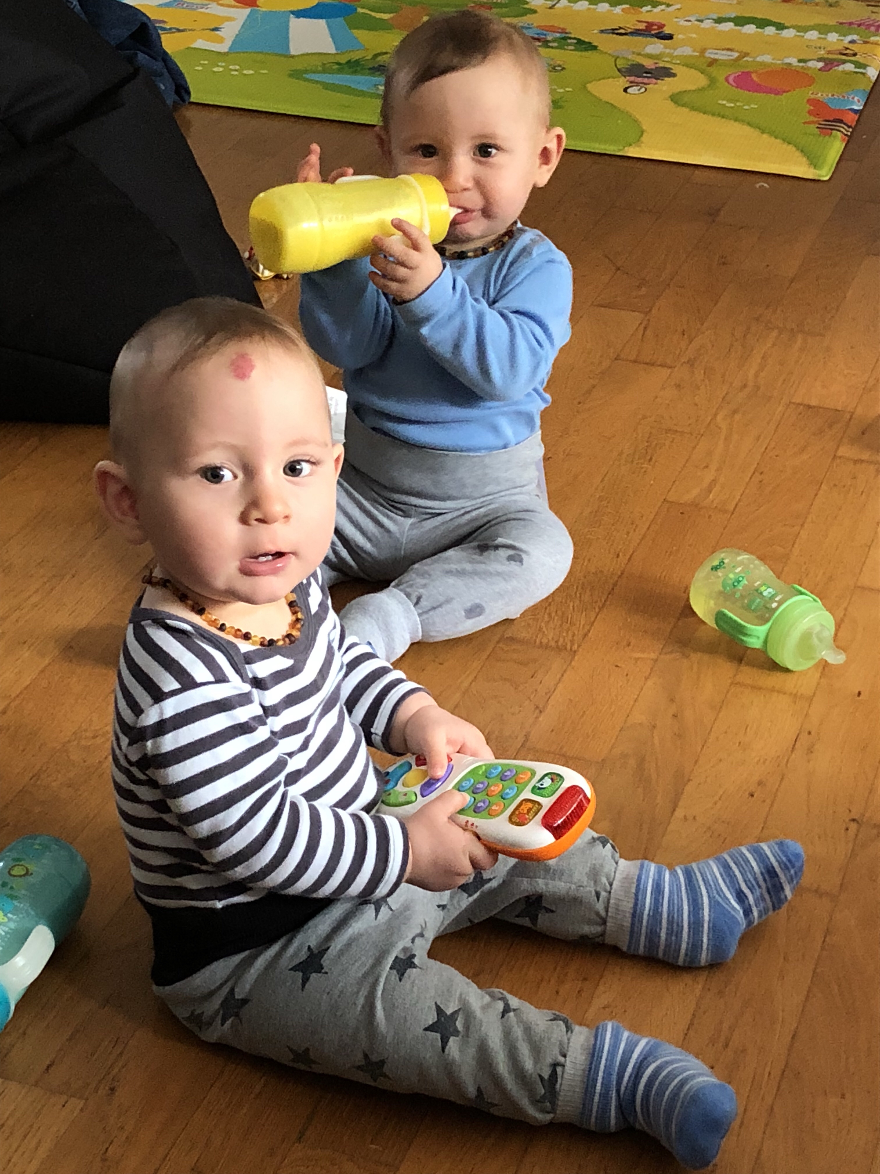 Ihr könnt heute zum ersten Mal beide laufen. Nur ein paar Schritte vorerst aber ihr läuft. Cool /-)))