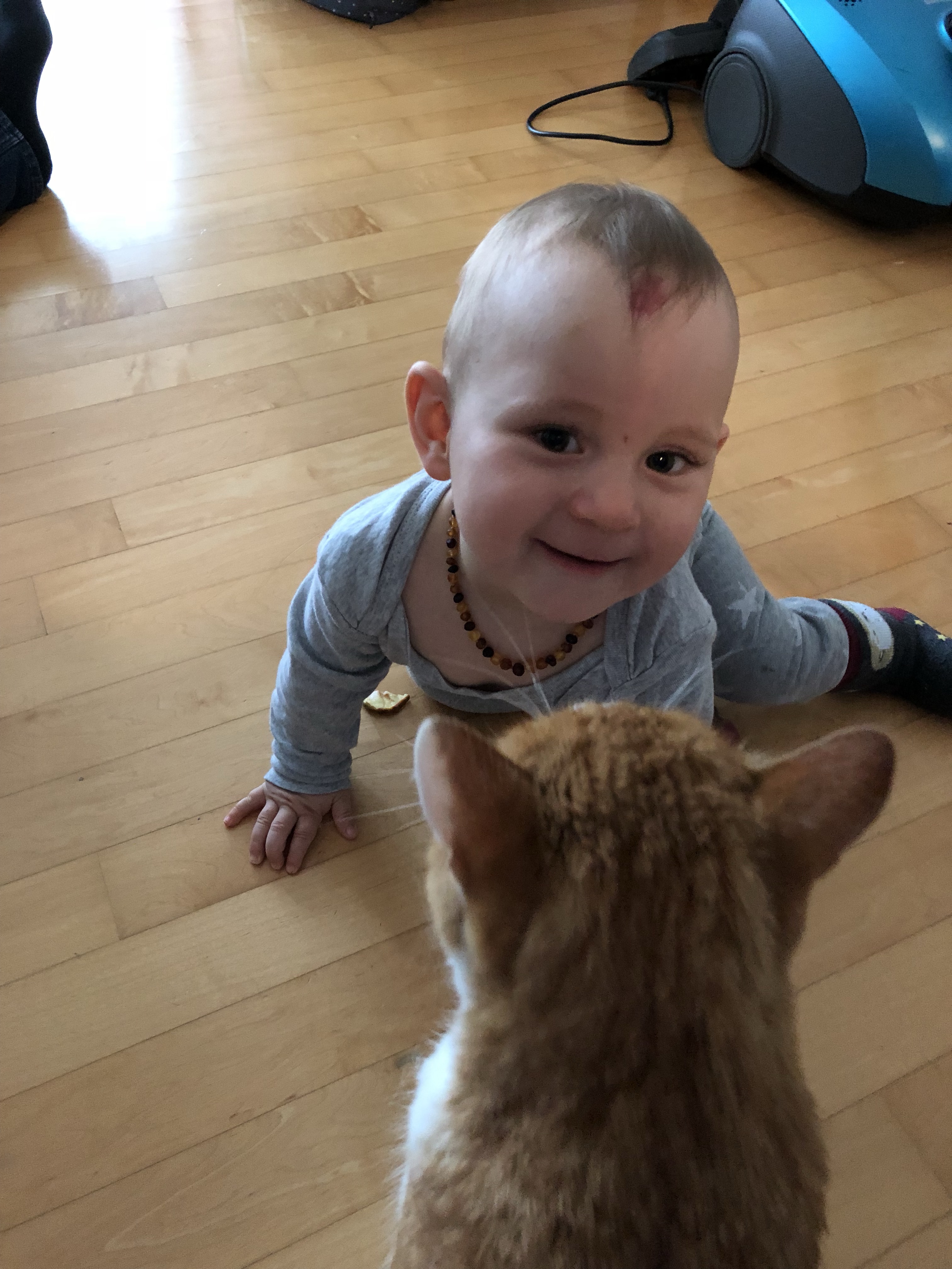 Ihr spielt immer mehr mit Leo und pünktli und die beiden lassen es sich teilweise sogar gefallen. Punktli zwar weniger, aber Leo spielt schön artig mit. Ihr habt beide spass an Leo und pünktli und krabbelt Ihnen nach.