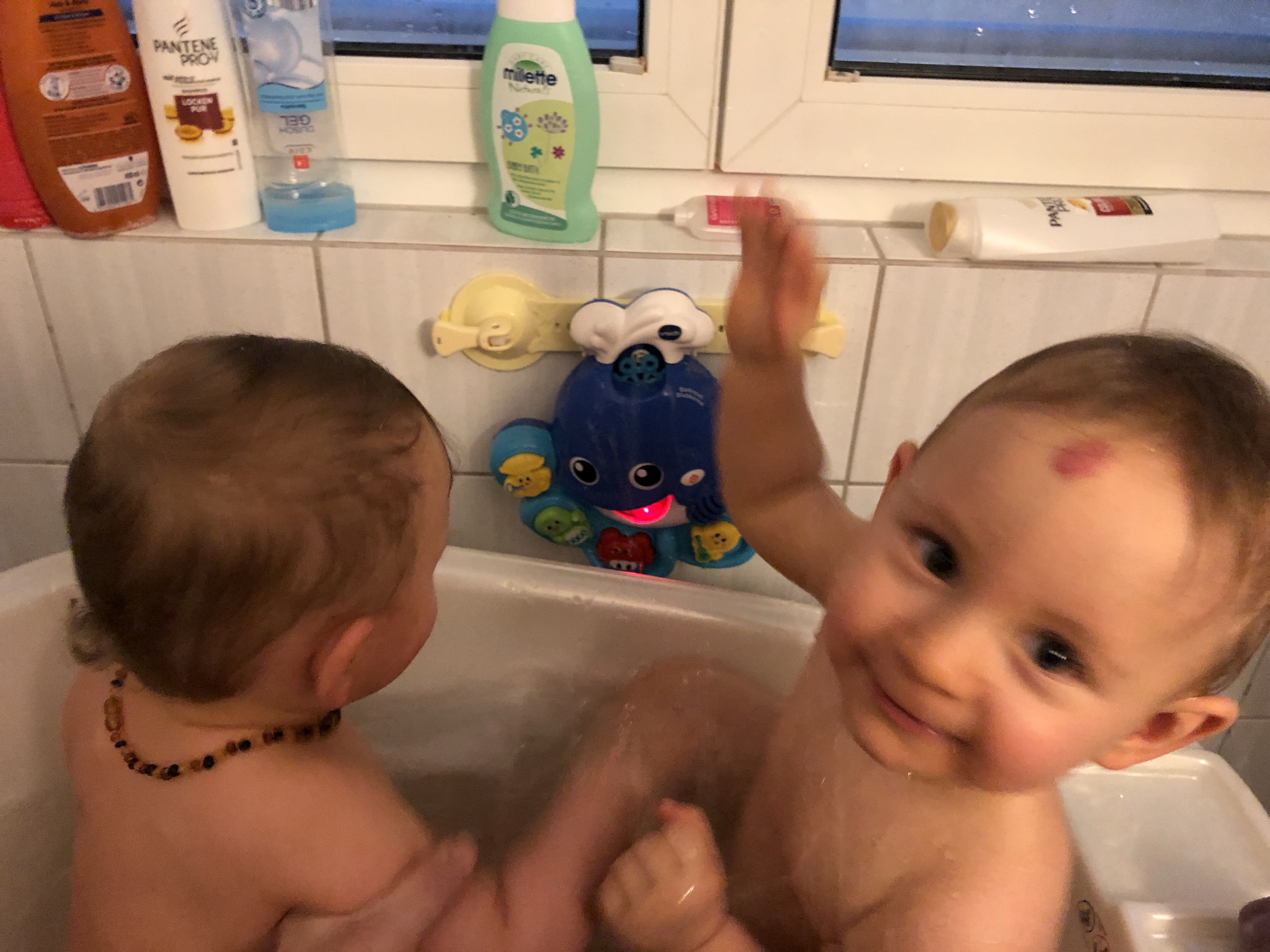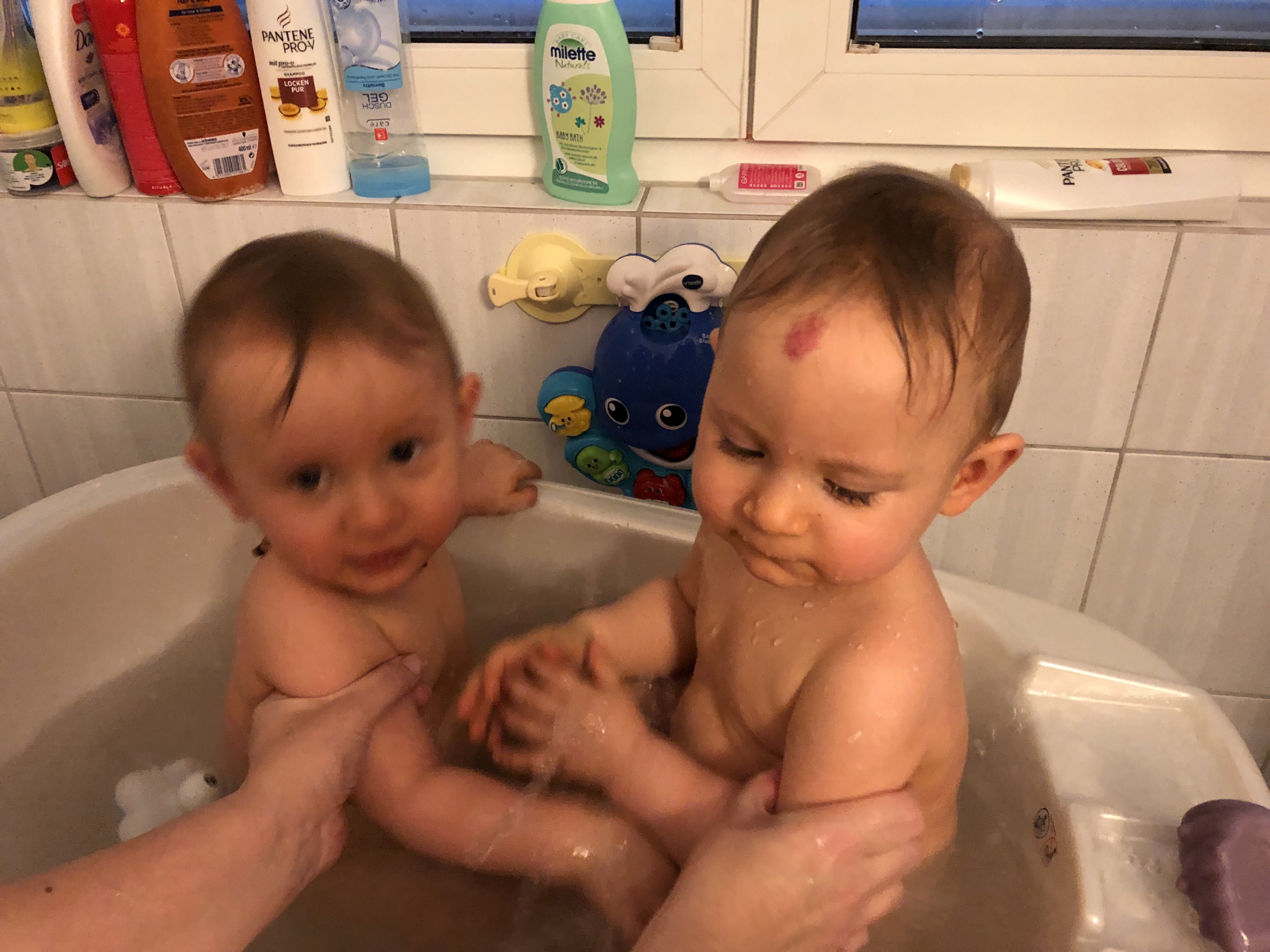 Ihr liebt es zu baden. Wir baden euch mittlerweile einfach in der normalen Badewanne. Da es nicht mehr möglich ist, den einen zu baden, während der andere wartet, weil ihr dann so blöd tut bis ihr endlich auch baden könnt, seid ihr beide zusammen im Bad.